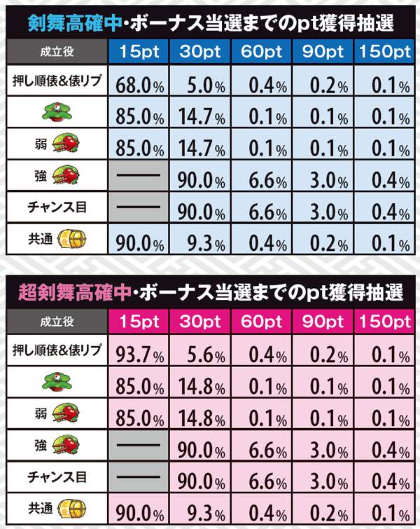 消化中は成立役に応じptを獲得し、超剣舞中は押し順俵でもpt獲得確定となっている。