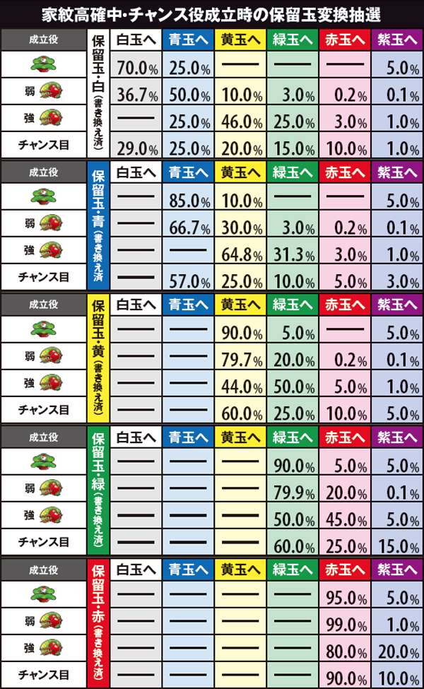 ※チャンス役時は5つの保留玉全てに昇格の可能性があるが、1度書き換えが発生した保留に関しては、以降は「書き換え済」の値を参照する