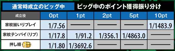 通常時に引いたビッグは家紋揃いでAT当選となるが、家紋が揃わなかった場合でもptを獲得することがあり、10pt貯まればAT確定だ。