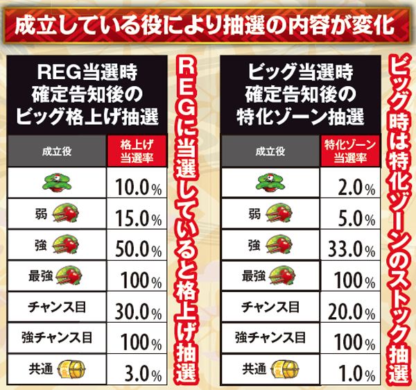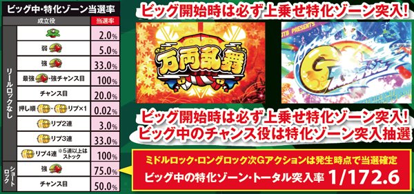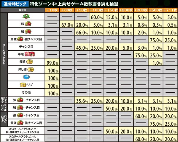 ビッグは必ず特化ゾーンから始まるようになったが、前作同様ビッグ中のチャンス役での突入抽選も行っている。全チャンス役からの突入率をトータルすると172.6分の1とかなり現実的なラインなので、なんとか引き当てたいところだ。