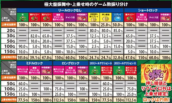 「極大盤振舞」はゲーム数上乗せの一部から突入し、消化中は成立役に応じて上乗せ抽選。押し順俵以外が成立した場合は上乗せの大チャンスとなり、チャンス役を引けば大量上乗せに期待が持てる。