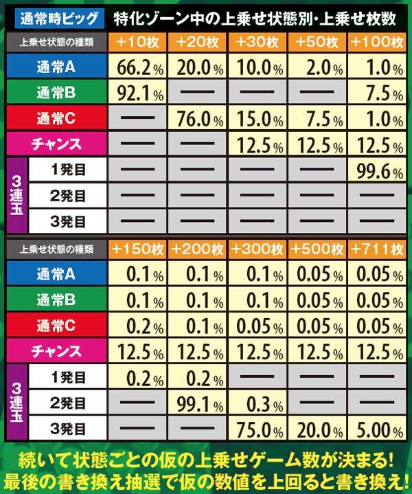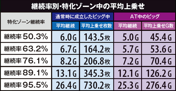 ビッグ・特化ゾーン中の上乗せ状態別上乗せ枚数