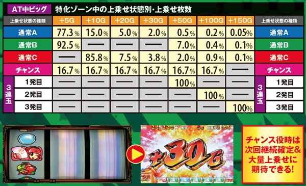 ATは1G純増約2.8枚、1セット80G継続のループ率管理型で、消化中は主にチャンス役成立でゲーム数上乗せや上乗せ特化ゾーン突入に期待。通常時と同様にボーナス抽選も行われ、もちろん各種高確率の重複もある。
