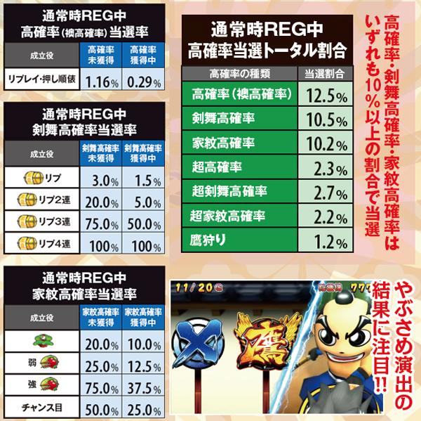 通常時に引いたREGは毎ゲーム各種高確率の権利獲得抽選をしており、通常時同様俵リプなら剣舞高確率に、チャンス役なら家紋高確率に期待。また、何も引けなくてもリプや押し順俵で(襖)高確率を抽選しているので、やぶさめ演出は常にアツい。
