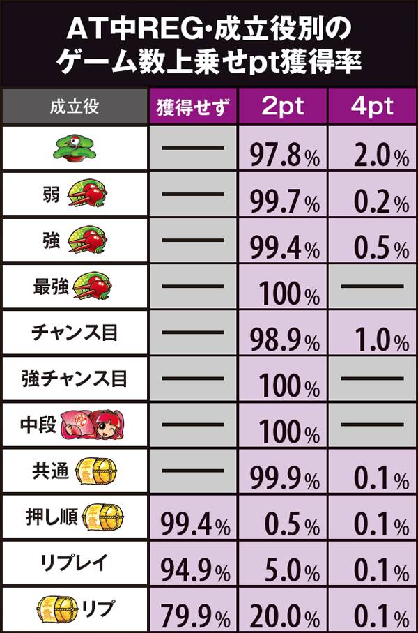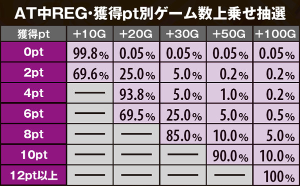 AT中に引いたREGは毎ゲームptの獲得抽選を行い、最終的に獲得したptに応じ上乗せゲーム数の振り分け抽選を行う。