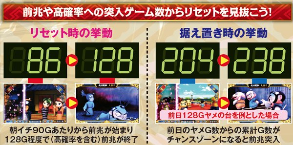 本機の前兆演出は電源を落としただけでは起点ゲーム数がズレることはないため、前日のヤメゲーム数をチェックしておけばリセットが見抜けることもある。リセット天国狙いや高設定狙い時に活用したい。また、本機はメニュー画面を出すと右上にキャラクターのアイコンが表示されるが、今作も朝イチは基本的に吉宗・くの一、ちび姫の3人のうちいずれかが選ばれる模様。吉宗以外のキャラクターなら早いボーナスに期待できたため、今作でも同様の立ち回りが通用しそうだ。