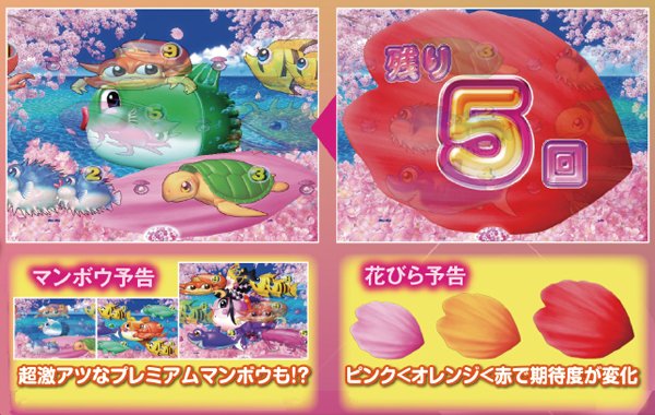 『沖縄3』ではハイビスカスだった役モノが今回は桜の花びらへとスタイルチェンジ。一発告知の桜フラッシュの他、ラウンド告知でも発動する。