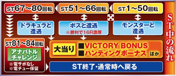 本機のSTは滞在回転数に応じて3つのモードが存在する。モンスター、ボス、ドラキュラなどそれぞれ違うテーマがあり、様々な形でハンティングラッシュを彩っている。ST最後の4回転は電サポなしの確変となっているが、ここで当たってもSTは継続する仕組みだ。