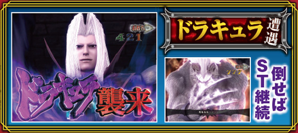 時計の針が24時を指す刻。連チャンを賭けた激闘再び…。 夜の支配者vs不死を狩る者、新たな仲間を加えバトルはより熾烈に! 本作の連チャンモード・ハンティングラッシュは超絶的な連チャン率を誇り、その値は94.5%。 今作はSTマシンとなっており、ST突入は80回転の時短・ドラキュラバトルからがメイン。つまり電サポ中の連チャンが超重要となる。なお、初当りからのST直撃もアリ。 |