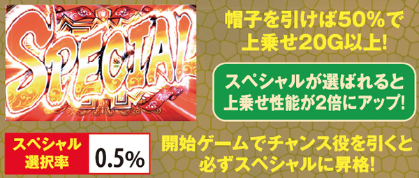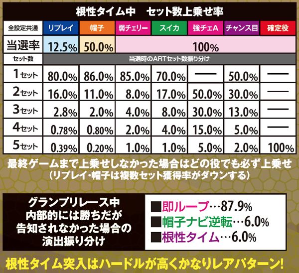 ART終了…と思わせて稀に発動する上乗せ特化ゾーン「根性タイム」。ここでは、成立役に応じてセット数上乗せ抽選が行われ、帽子でも50%、チャンス役なら100%上乗せをゲットできる。確定役は一撃5セットだ。