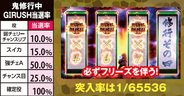 フリーズを伴って発動する「鬼修行」は、出現率65536分の1と超激レア。セット数上乗せ&GⅠRUSHの0G連が4回発生するので、これさえ引ければ大勝ち必至だ。