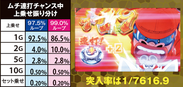 ボタンPUSHごとにゲーム数を獲得できる「ムチ連打チャンス」は、継続率97.5%と99%の2種類がある。2G上乗せが多ければ、99%濃厚!?
