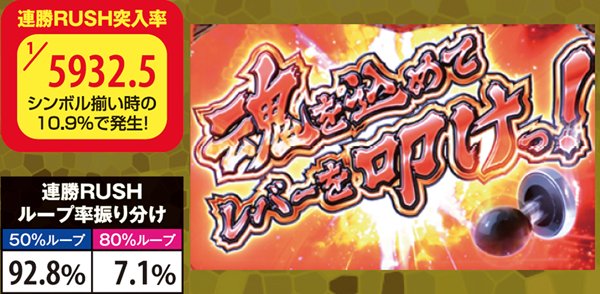連勝RUSHは、セット数上乗せの0G連。内部的にはループ率50%と80%の2種類があり、80%の選択率は約7.1%と激レア。突入条件はシンボル揃い時の10.9%とかなりの難関だ。