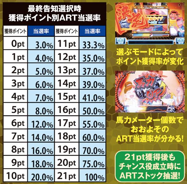 ビッグ中最終告知を選んだ場合は、モードと成立役に応じて毎ゲームポイントが溜まる(馬力メーターである程度告知)。累計21pt獲得でART当選確定だ。