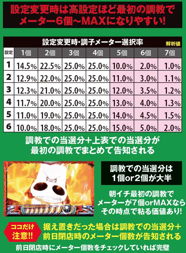 設定変更(リセット)が行われた場合は内部的にメーターの再抽選(1〜7個)が行われ、朝イチ最初のメーターアップの際に表面化(それまでは判別不能)する。
