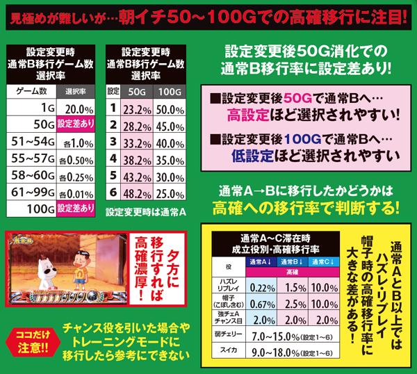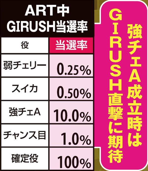 チャンス役からの「ボーナス直撃」には設定差があり、強チェリーA以外がボーナスに結び付いた場合は、それだけで高設定の可能性アップとなる。状況によっては見極めが難しくなるケースもあるのだが、必ずチェックしておきたい。