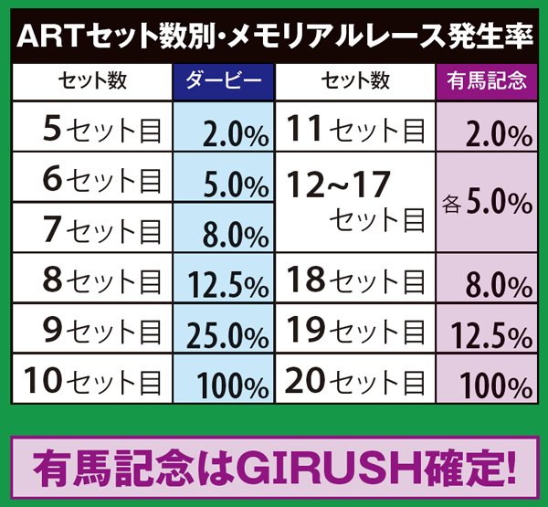 メモリアルレース(日本ダービー、有馬記念)は、ARTの継続が確定、さらにG1RUSH突入も確定となる。日本ダービーに突入したあとは継続率が75%以上に昇格するので、まずは1セットでも多く継続させてダービーを待ちたい。