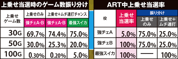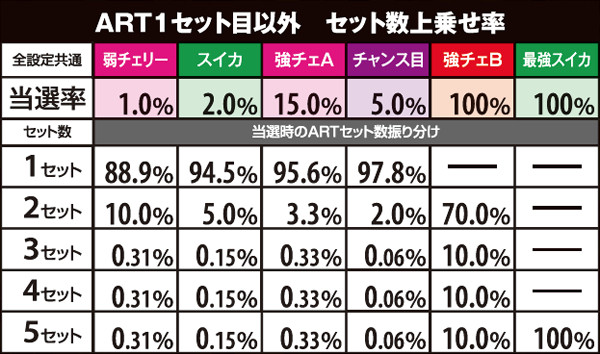 ART当選率よりもビッグによる大量出玉獲得(差枚数上乗せ)を目指すものなので、通常以外を選ぶと出玉獲得の期待度こそ大きく上がるものの、ART当選率はグンと下がる。したがって、ARTを目指す場合は避けた方が無難…ではあるのだが、トータルでの獲得枚数で損をするということはない。