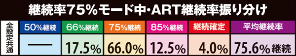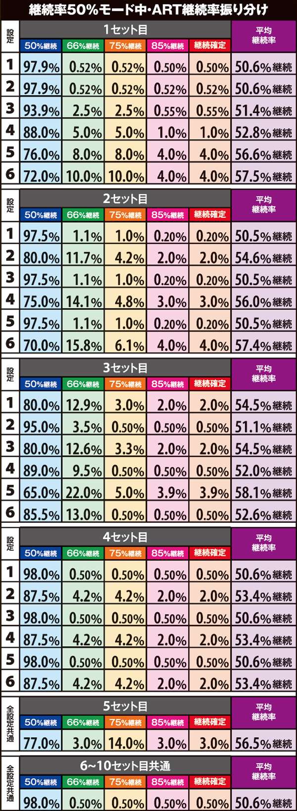 ループ率が50%の場合でも内部的には再度継続率の抽選が行われるという仕組みのため、実際の継続率は50%よりも高くなる(高設定ほど継続率アップ)。また、設定の奇数・偶数で傾向が異なる点も要チェックだ。