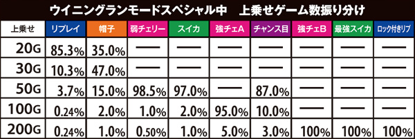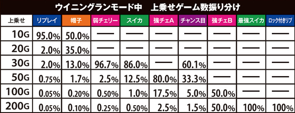 4G間の毎ゲーム上乗せゾーン「ウイニングランモード」では、当然レアな役ほど多くのゲーム数を獲得しやすい。ただし、仮に帽子でも半数は20G以上なので、予想外に伸びるケースもアリだ。