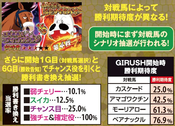 ボーナス開始時の抽選がポイント。消化中にマキバオーの人気が高くなるほどART期待度は高くなるので、まずはスタート時点での人気が少しでも高いことを祈ろう。