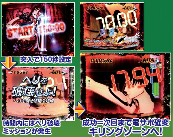 確変・キリングゾーンは敵に応じて勝利期待度と勝利時の獲得ラウンドが変化する。たとえ勝ちにくい対戦相手であっても、ココを凌いで勝ってしまえばその報酬は高く、16R=2200発オーバー獲得の可能性が高くなる。