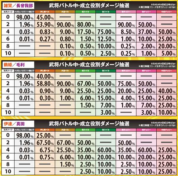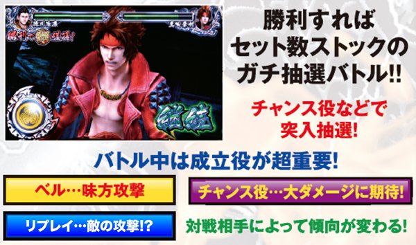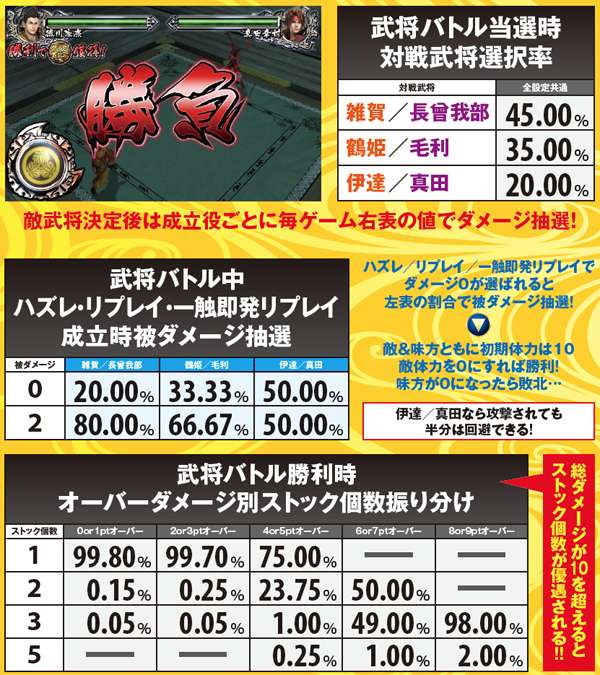 武将バトル突入時は、まず所定の割合で対戦武将を決定。継続中は成立役に応じて味方or敵の攻撃及びダメージ抽選が行われ、基本的にレアな役ほど大ダメージを与えられる。また、10pt以上のダメージを与えての勝利時はストック数が優遇。例えば、敵の残りダメージがほぼない状態で中段チェリーを引き当てたとしても、ヒキ損は一切ないというわけだ。