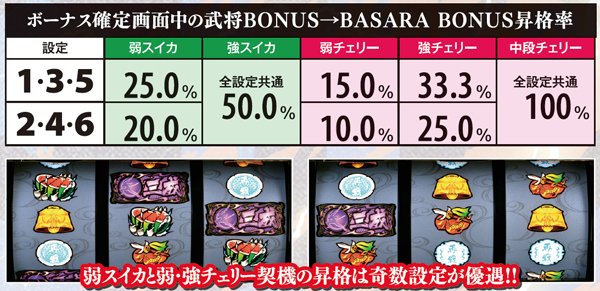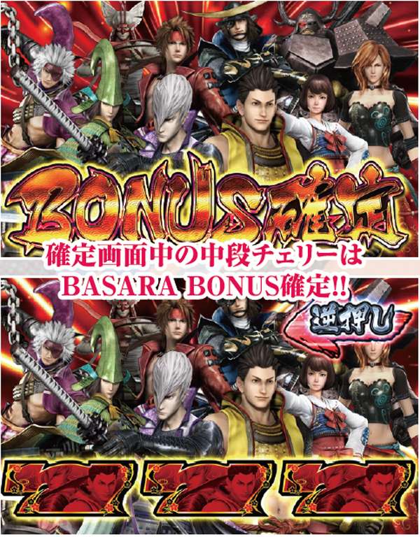BASARA BONUS中は7揃い、武将BONUS中はロゴ揃いで10G以上の上乗せ確定。BASARA BONUS中はチャンス役成立で「7揃い高確」移行のチャンスで、移行後は文字通り高確率で7揃いが発生する。