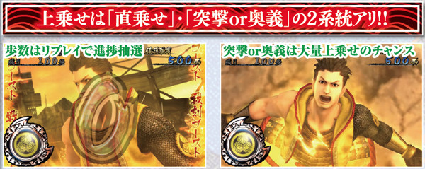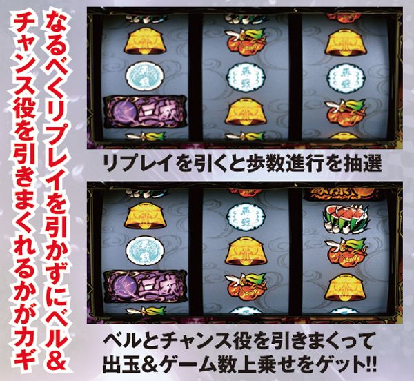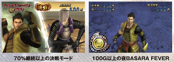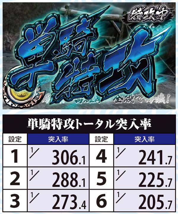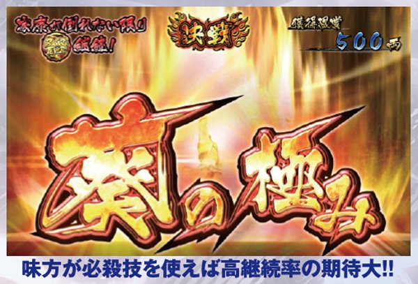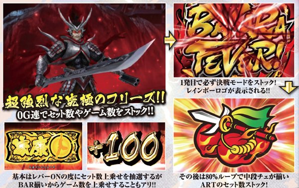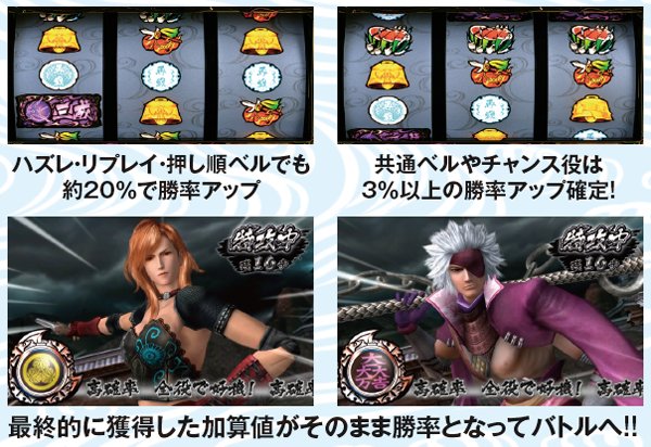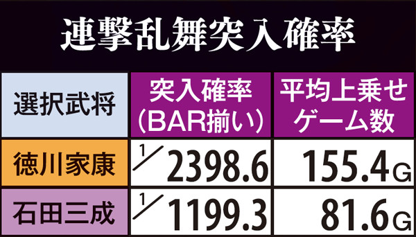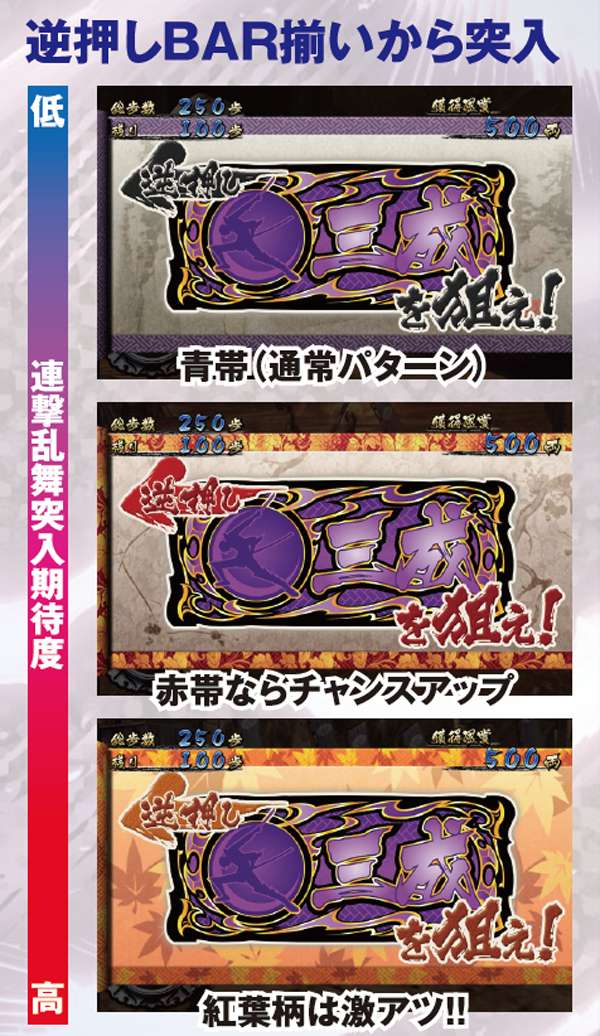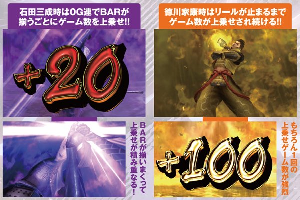 レバーONでカットインが発生したら、逆押しで該当BAR絵柄を目押し。見事揃えば選択武将に応じた連撃乱舞が発生→0G連でゲーム数が上乗せされ続ける。ここでも選択武将の特徴が反映され、石田三成は小刻みに上乗せ、徳川家康は1回の上乗せゲーム数が大きくなる。