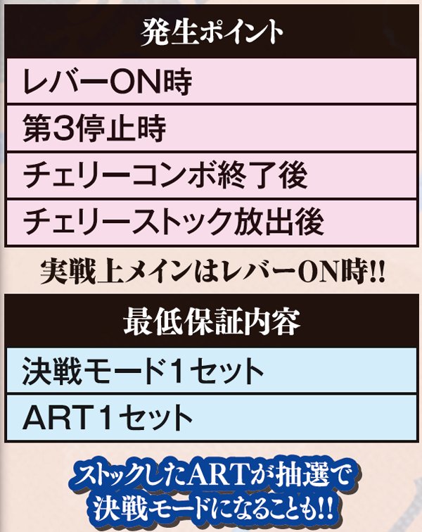 タイミングを問わず発生すれば、まずは1発目で決戦モードをストック。以降は80%ループの0G連で中段チェリーが揃うたびにARTセット数がストックされ、BAR揃いからゲーム数上乗せに発展することもある。発生率は極めて低いが、是非とも引き当てたい。