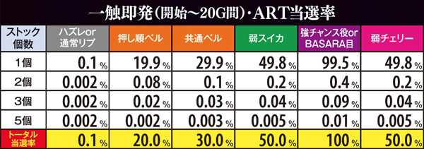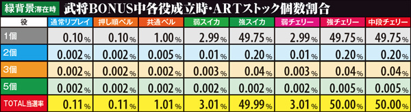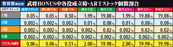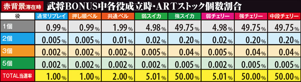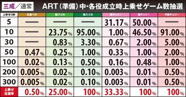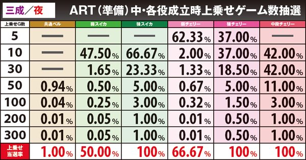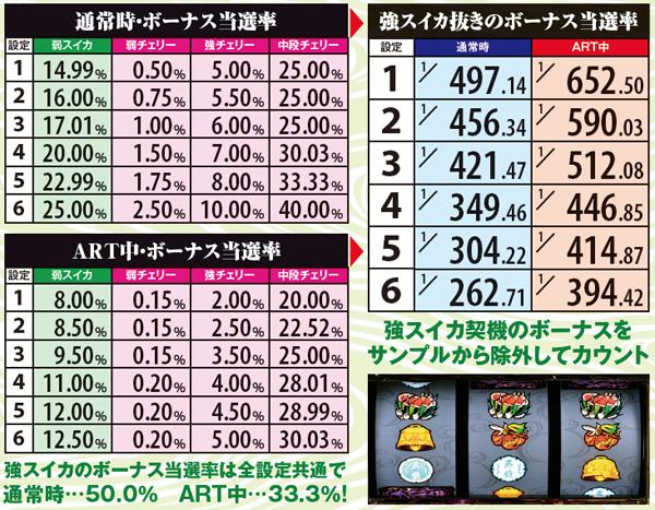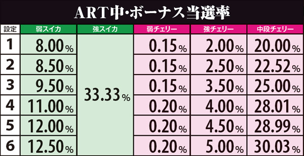 ART中はチェリー出現率がアップしている分、各役成立時におけるボーナス当選率は若干抑えられているのが特徴で、メイン契機である強スイカ成立時のボーナス当選率は約33%。ART中にボーナスに当選すると、その時点で10G以上の上乗せが確定する点も大きなポイントのひとつだ。