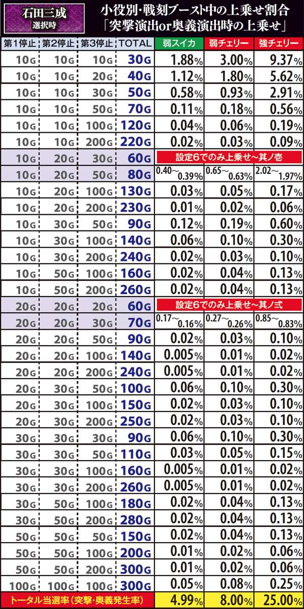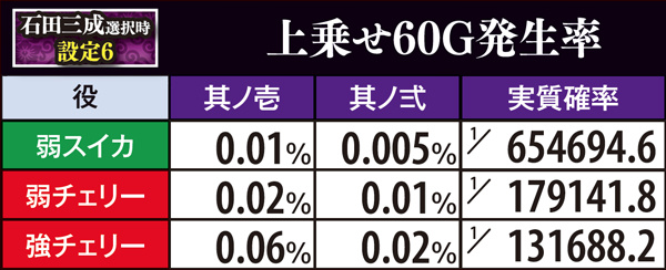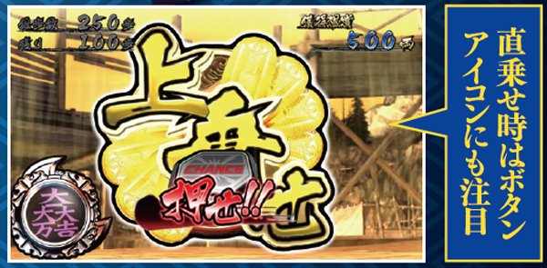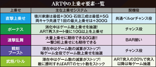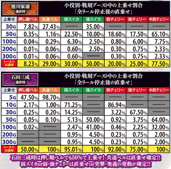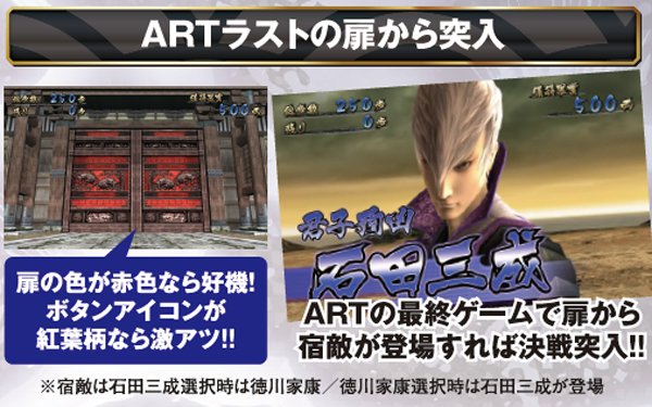 石田三成選択時は強スイカ・強チェリー・中段チェリー成立で上乗せ確定。上乗せ期待度の高まる夜ART中ならば弱スイカでも2分の1で上乗せに繋がる。ただし、上乗せ当選時の大半は10G以下となるので、手堅くゲーム数を加算させたいプレイヤーにオススメだ。