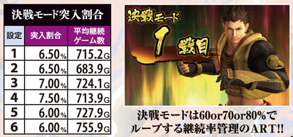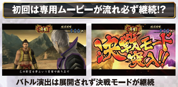 決戦モードの1セット目は専用ムービーが流れることから、必ず継続する模様。以降は最高80%の継続抽選に漏れるまでループし、継続するか否かのジャッジはバトル演出を介して行われる。攻防パターンで継続期待度及び継続率が示唆されるので、バトル中は一挙手一投足に要注目だ。
