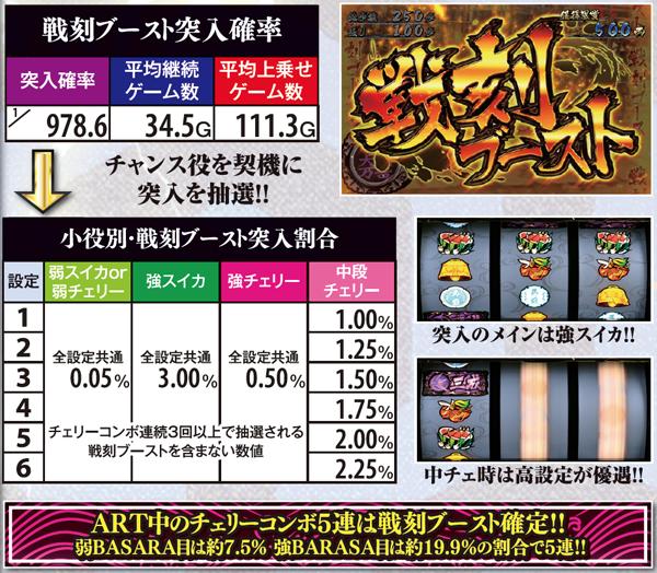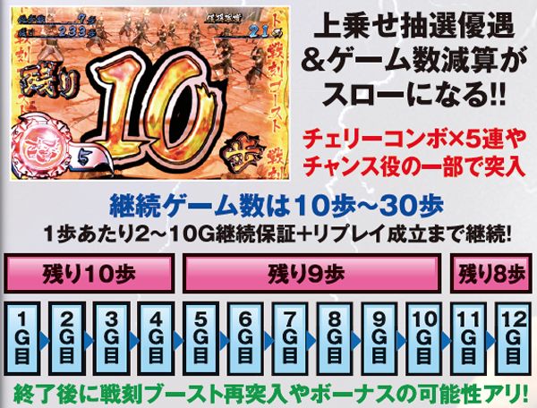 歩数がゼロになるまで継続する戦刻ブーストへの突入契機はチェリーコンボ3連以上や強スイカなどで、中段チェリーからの突入率には設定差が存在。