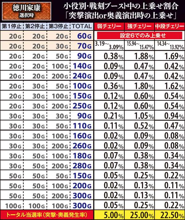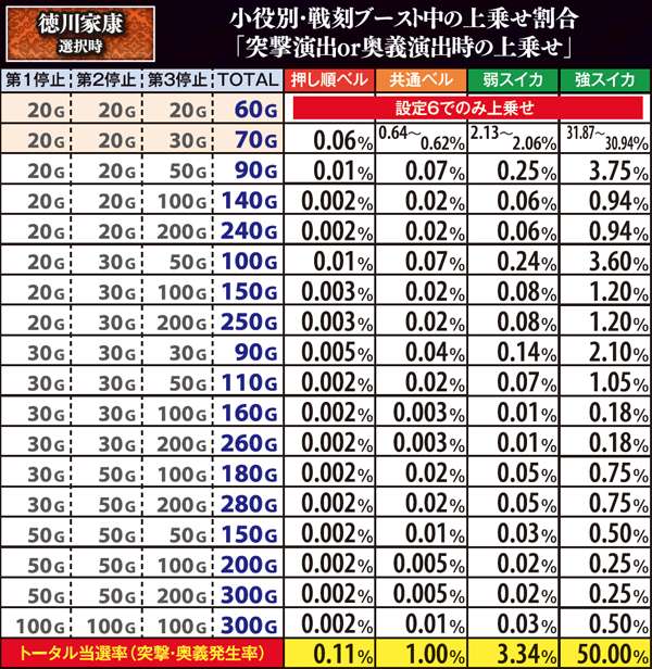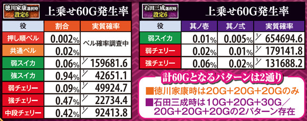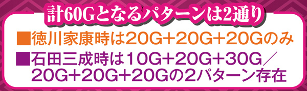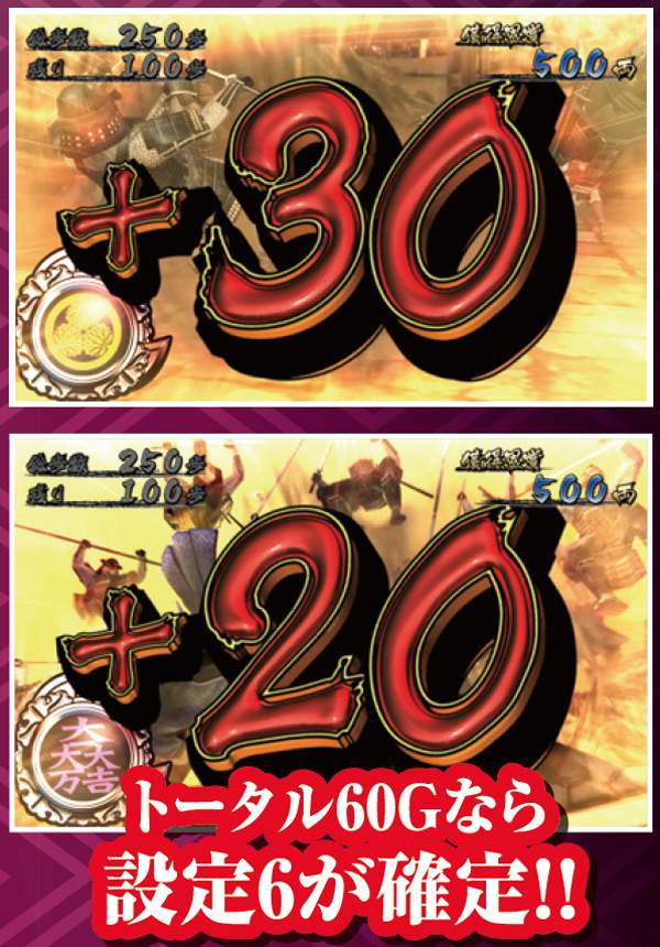 徳川家康は強スイカの2分の1で突撃or奥義へ発展。全てのチャンス役が発展契機となっていることもあり、設定6確定の上乗せ「+60G」が石田三成よりも発生しやすいといった特徴がある。設定6確定パターンを拝むべく、徳川家康を選択するのも一興だ。