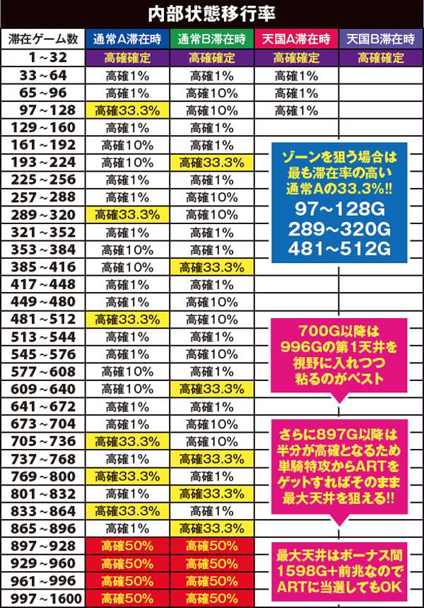 チャンス役出現時の単騎特攻突入率に影響を及ぼす内部状態はゲーム数区間の当選率で管理されており、ゾーン狙いが可能。897G以降は通常AorBを問わず高確当選率が50%まで跳ね上がるので、絶好の狙い目となる。