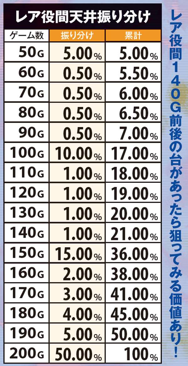 レア役間天井は50~200G間で、一度もチャンス役を引かなければ必ず単騎特攻へ突入。何ゲームが選ばれているかを外部から判断することは不可能だが、ボーナス間天井と同様、通常時にCHANCEボタンを長押しすれば現在のハマリゲーム数がチェックできる。チャンス役間で大ハマリしている台を見付けた際は打つ価値アリだ。