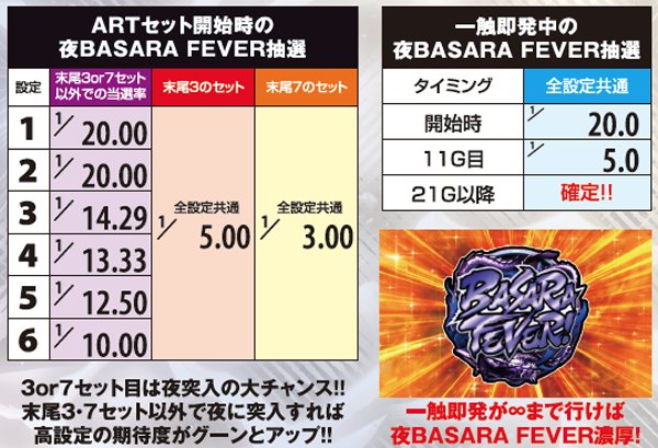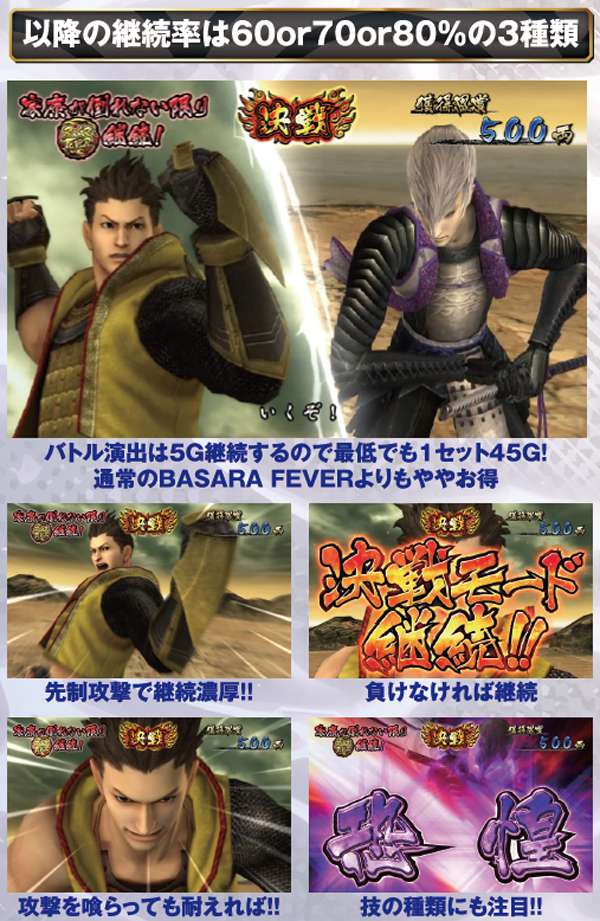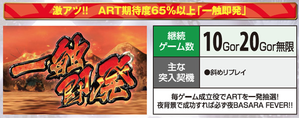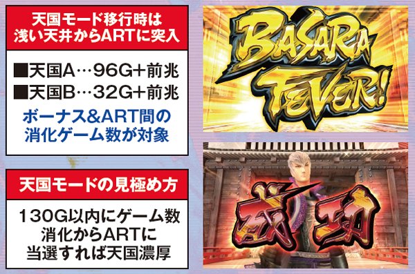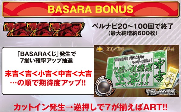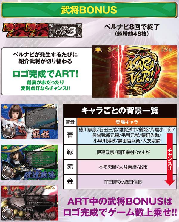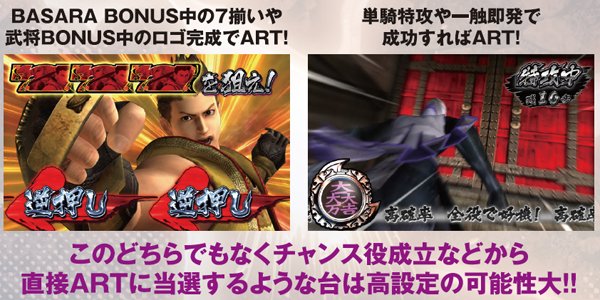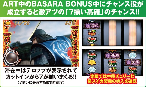 通常時のBASARA BONUS中は「BASARAくじ」発生で7揃い確率アップ抽選が行われ、実戦上、大吉まで発展すれば激アツ。カットイン発生時は逆押しで7を狙い、見事揃えばART当選となる。通常時の武将BONUS中は背景色が重要。レアな背景ほど期待度は高まり、赤や金になればロゴ完成、即ちART当選の大チャンスを迎える。
