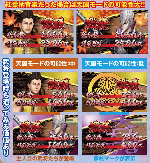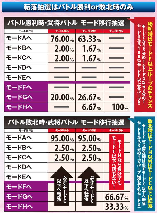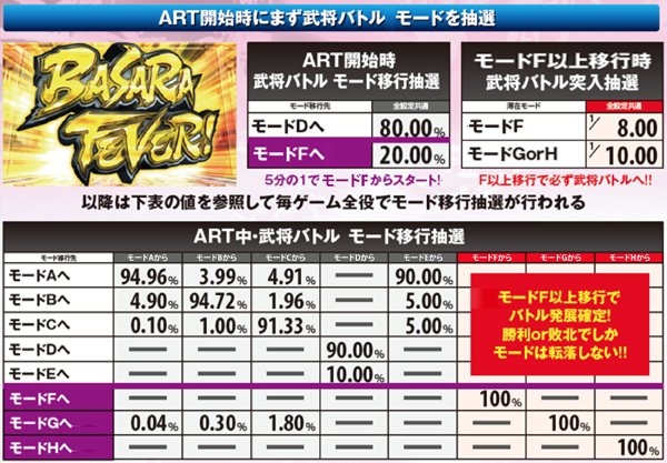 武将バトルのモードは8種類で、モードF以上への移行でバトル発展が確定。モードA〜E滞在時は毎ゲーム、上表の割合でモード昇格抽選が行われるが、ひとたびモードF以上へ移行すればバトル勝利or敗北でしかモード移行せず、勝利時はモードFのループ、即ちバトル再発生にも期待できる。首尾よくモードHへ移行すれば、勝ち続ける限り武将バトルが発生→大量セット数上乗せの大チャンス到来となる。