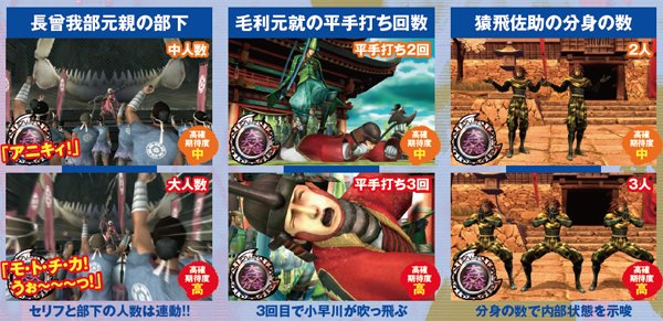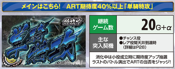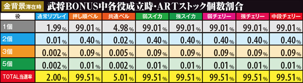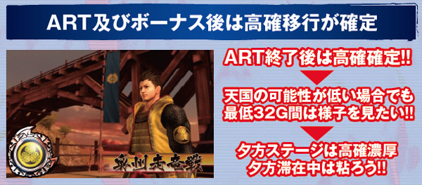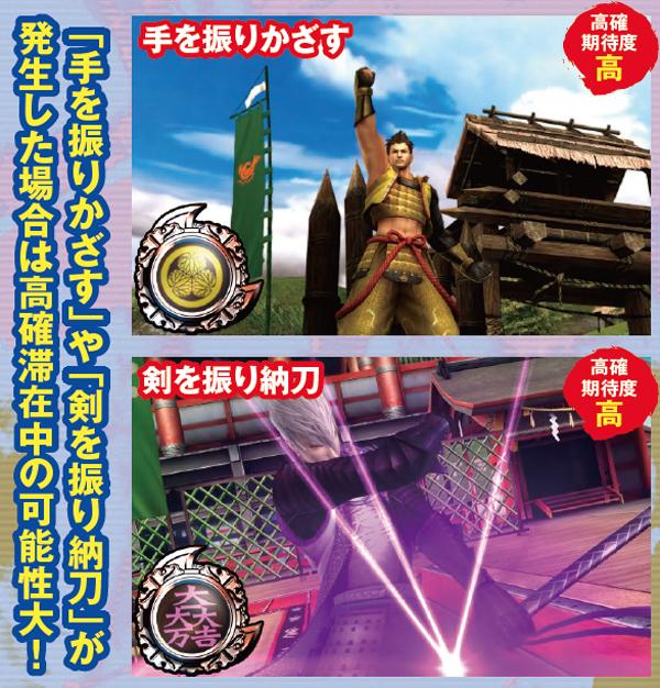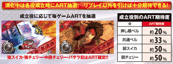 武将バトル中はベル(押し順・共通不問)orチャンス役成立で味方が攻撃し、リプレイ時は敵の攻撃の可能性が高く、体力消耗のピンチ。勝利、即ちセット数獲得期待度は対戦相手によって変化するが、小役のヒキがより重要となる。なお、この間はARTのゲーム数減算がストップする。