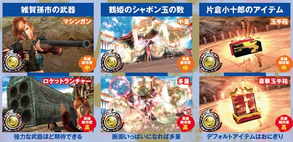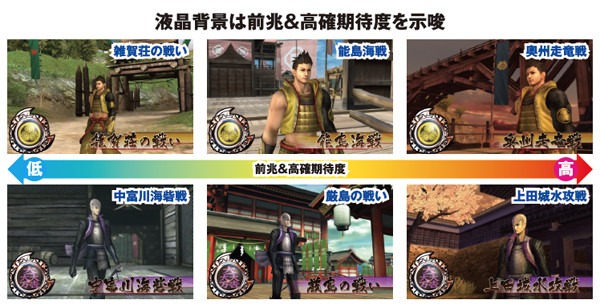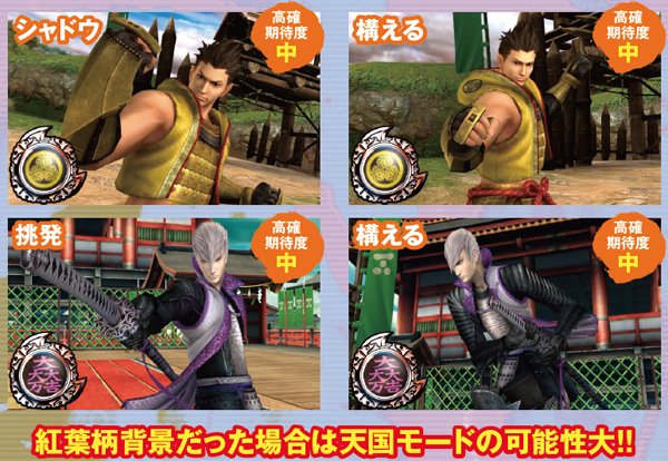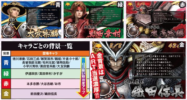 通常時のBASARA BONUS中はカットイン時に7が揃えば、武将BONUS中はロゴが完成すればART当選。各種期待度はくじの種類や背景色で変化する。