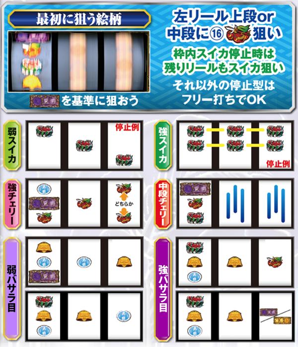 DDT打法はいわゆるチェリー落としで、スイカを引き込んだ時のみ残りリールにもスイカをフォローすればOK。チャンス役の強弱は停止型や入賞音から見極められる。