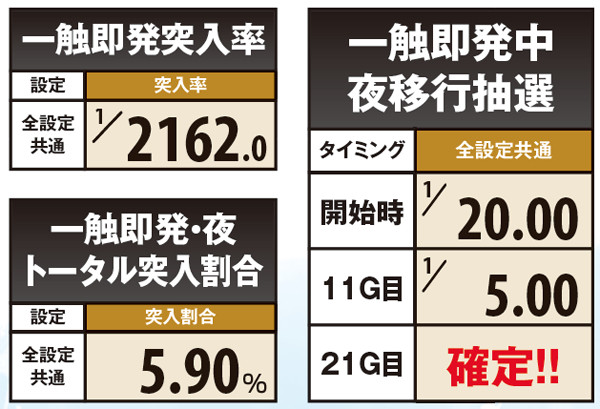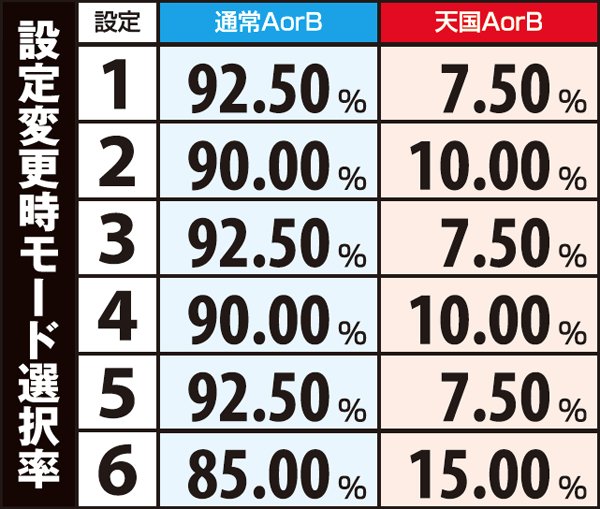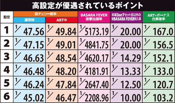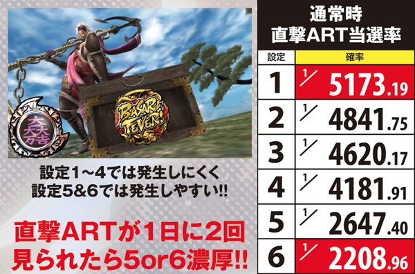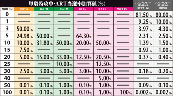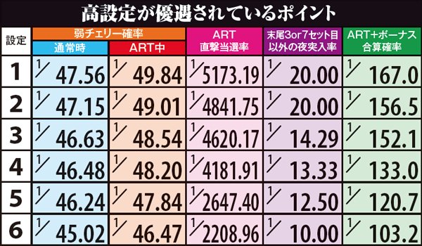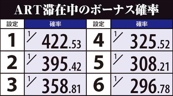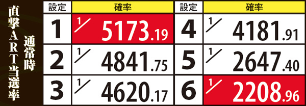 ボーナスや自力高確ゾーンを介さない直撃ART当選率は上記の通りで、高設定、とりわけ、設定5以上が優遇。確率の分母自体が低いので即効性はないが、1日に2回以上確認できれば設定5以上の可能性が飛躍的に高まる。