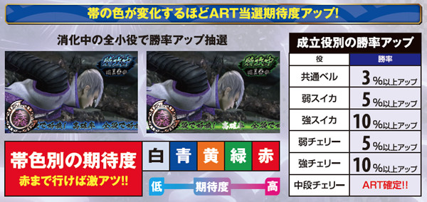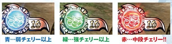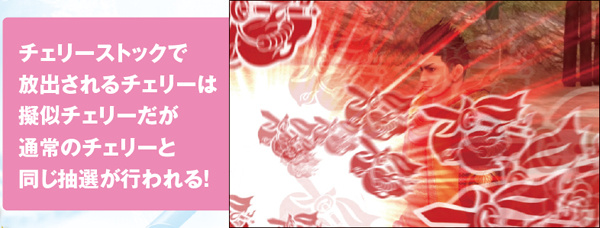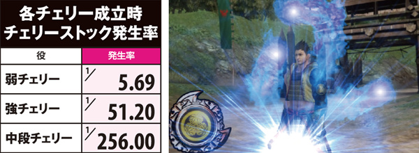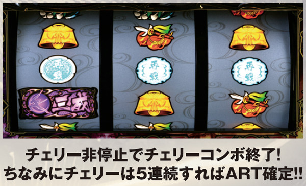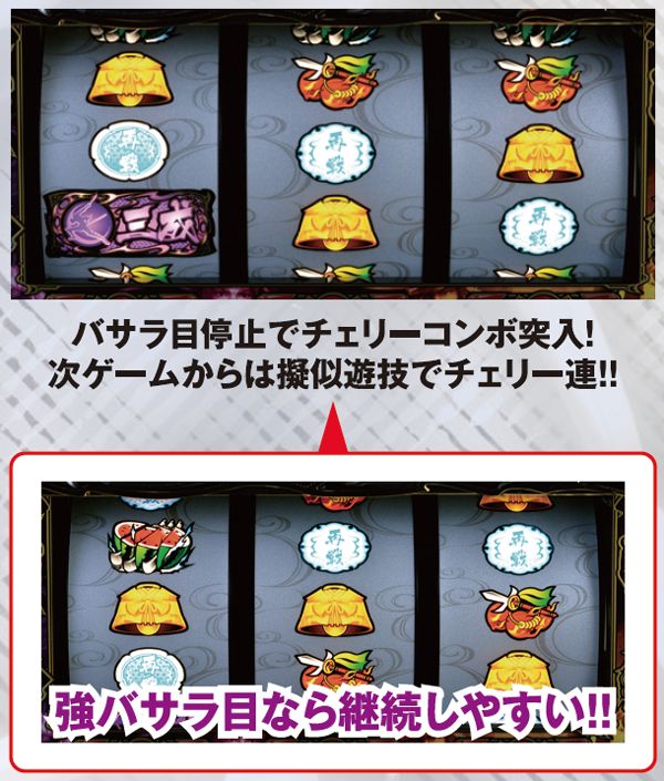 チェリー連打が狙えるチェリーコンボは、強or弱バサラ目停止で突入。前作ではチェリー回数固定だったが、今作では決まっておらず、チェリー5連続入賞でARTが約束される。チェリーストックはチェリー成立時の一部で発生。ストック時はアイコンで期待度が示唆され、緑以上へ変化した場合は強チェリー以上への昇格が濃厚だ。
