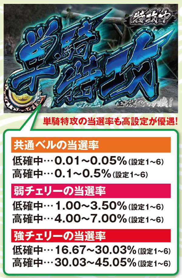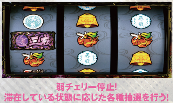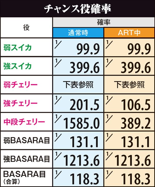 バサラ目はチェリーが停止する限り継続し、継続すればするほどチェリーは昇格しやすくなる。もちろん、この間のチェリーも通常時と同様の確率で抽選が行われているので、継続が優遇されている強バサラ目は大チャンス到来となるわけだ。