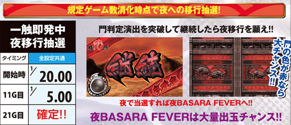 (天井到達後は数十Gの前兆を経由して70%継続以上の決戦モード+100G以上の夜BASARA FEVERに突入)
