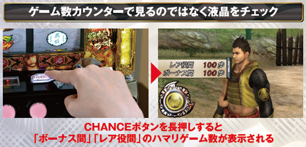 CHANCEボタンを長押しすると、液晶画面上にボーナス間・レア役間のゲーム数が表示される。