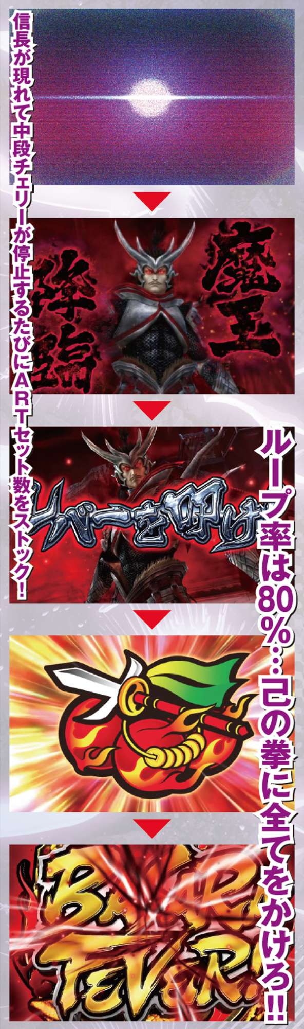 魔王降臨フリーズが発生すると、80%の高確率で中段チェリーが0G連。1発目は必ず決戦モードがストックされ、以降はARTセット数が上乗せされる。また、BARが揃って上乗せの0G連へ繋がることもある。