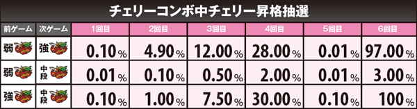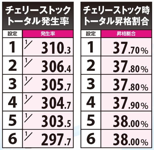 各チェリー成立時は所定の割合でチェリーストックが発生。放出までの間はチェリー昇格に期待でき、放出時も再度各種抽選が行われる。なお、チェリーストックトータル発生率及び昇格割合は上記の通り。どちらも高設定の方が優遇されているが、数値差は極めて微小である。