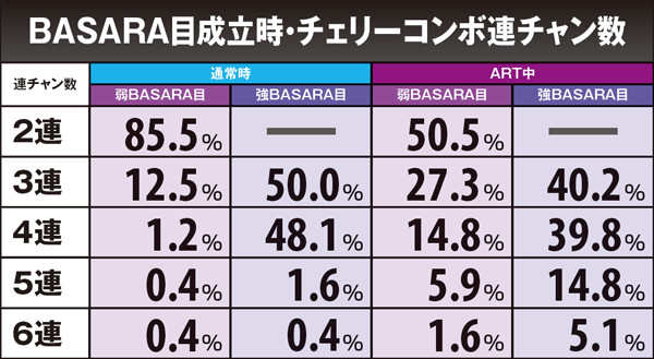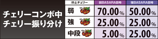 強弱2種類あるBASARA目成立後は、その種類と状況に応じてチェリー連チャン数を決定。強BASARA目はその時点で3連以上が確定し、ART中ならば5連以上が選ばれることも多々ある。また、チェリーコンボは連チャンするほど昇格により強チェリー以上が出やすくなる点もポイントのひとつだ。